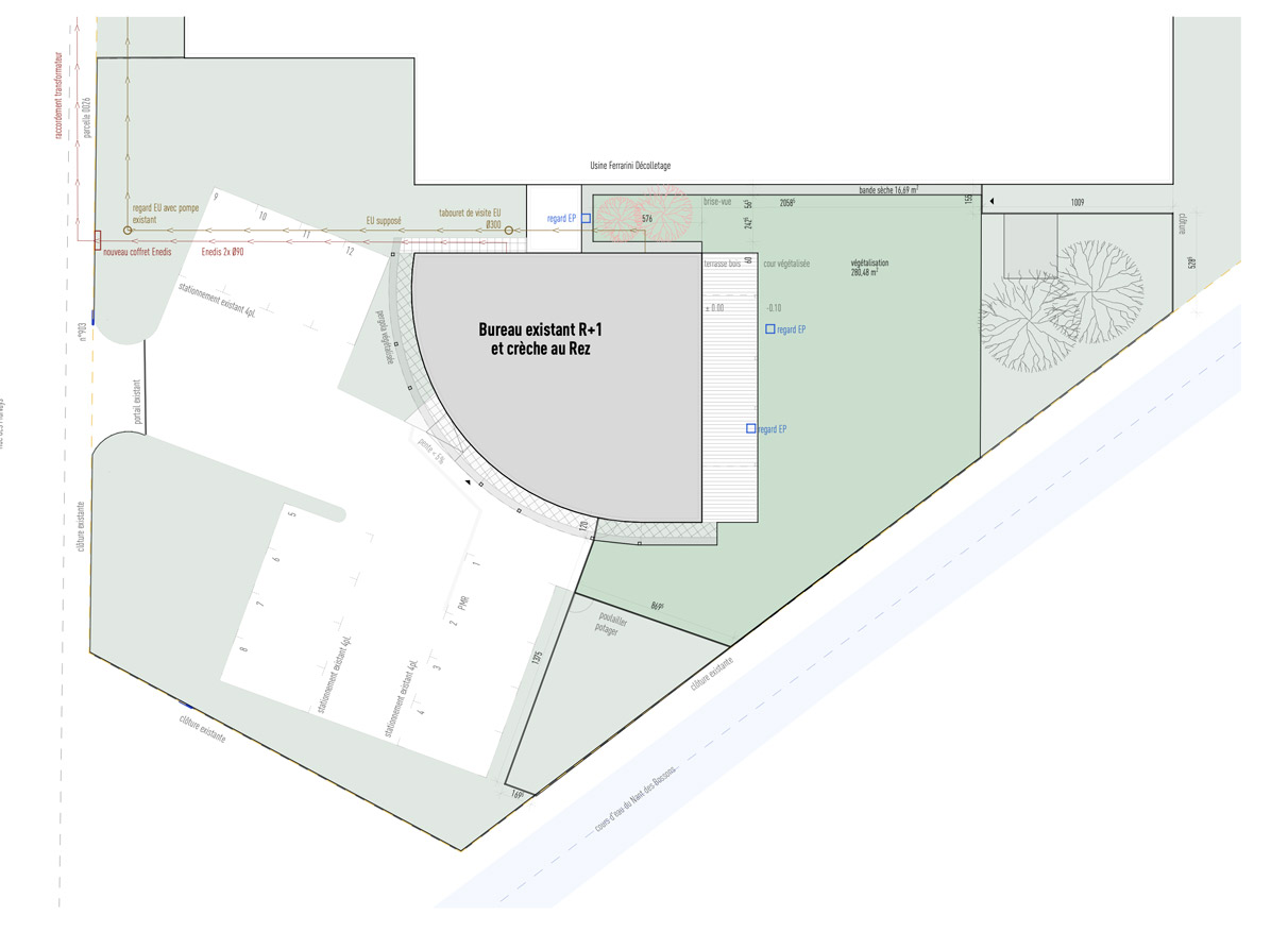 Une nouvelle crèche en zone industrielle à coté de la voie verte avec un grand jardin et potager d’environ 300m2.